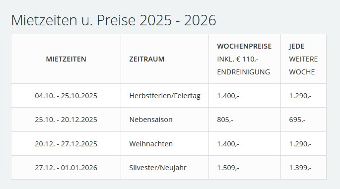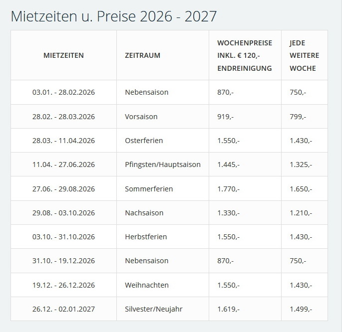 - Die Endreinigung beträgt ab 01.01.2026 € 120,- je Aufenthalt und ist im ersten Wochenendpreis enthalten.